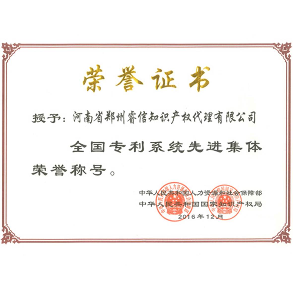 由人力資源和社會保障部、國家知識產權局聯(lián)合舉辦的全國專利系統(tǒng)先進集體和先進個人評選中,公司榮獲“全國專利系統(tǒng)先進集體榮譽稱號”。